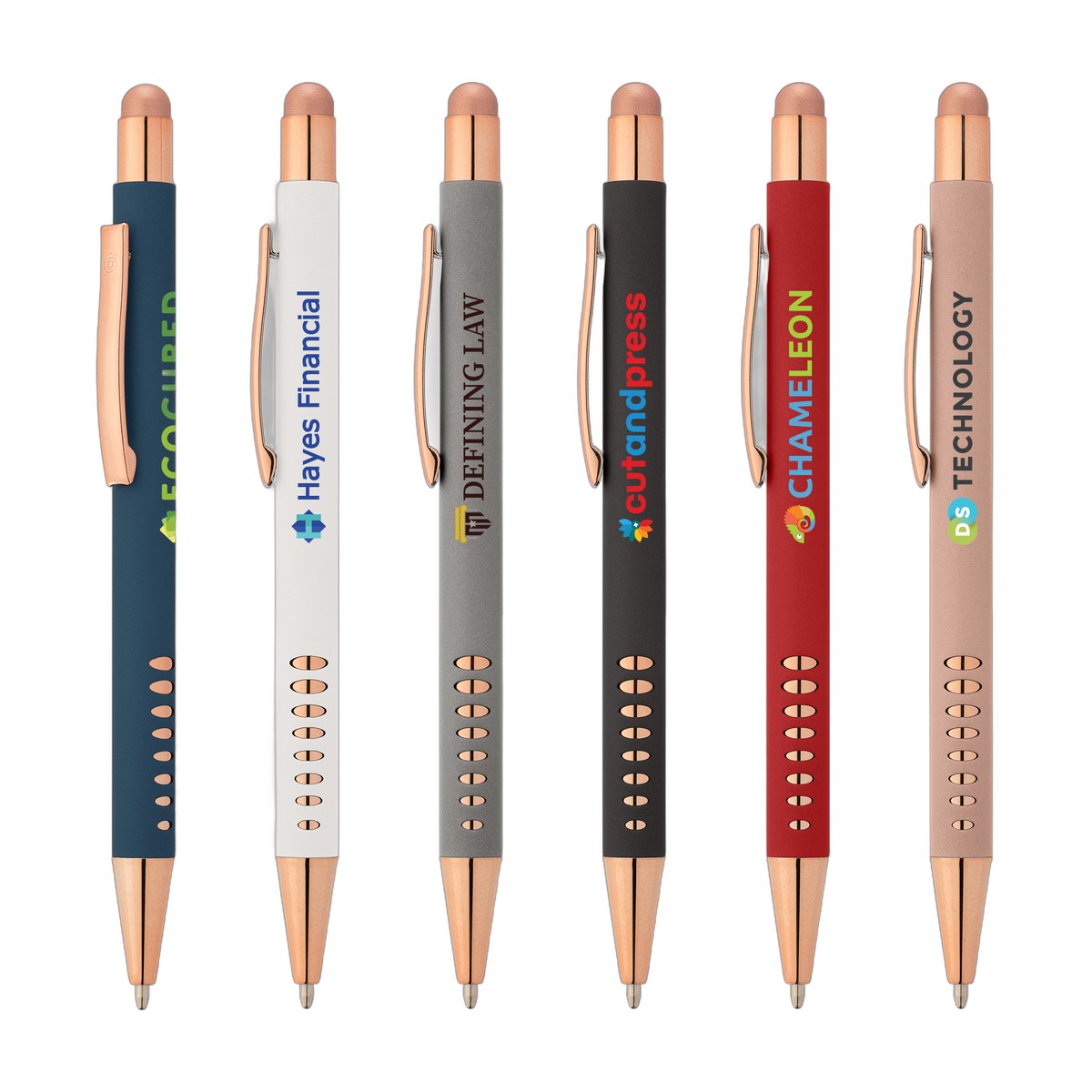 Introducing the Bowie Rose Gold Stylus Pen, a perfect blend of style and function. Crafted with precision, this pen features an aluminum barrel with cutouts, showcasing a captivating rose gold accent. The matte rubber finish adds comfort, while rose gold accents with a mirror finish on the tip, plunger, and clip create a luxurious aesthetic. With a smooth-writing, high capacity ballpoint cartridge, this pen makes writing a pleasure. Your logo will be Laser Engraved with rose gold mirror finish, so your brand will truly shine. Complies with Prop 65. 5.57" W x 0.39" D