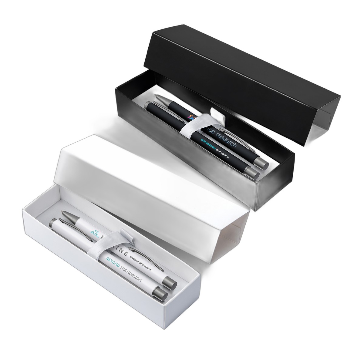 With this giftset customers can experience the best of Bowie soft-touch rubberized metal pens. Each boxed giftset includes a click-action ballpoint and capped rollerball pen. Customize each Bowie pen with a mirrored laser engraved imprint, and customers are sure to enjoy this gift—and the writing experience! Complies with Prop 65. 2.05" H x 6.97" W x 1.38" D