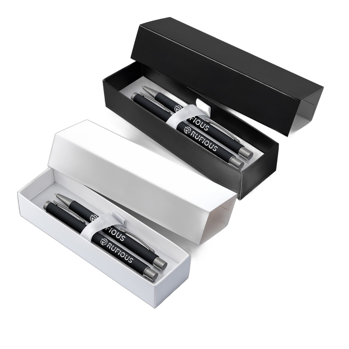 With this giftset customers can experience the best of Bowie soft-touch rubberized metal pens. Each boxed giftset includes a click-action ballpoint and capped rollerball pen. Customize each Bowie pen with a mirrored laser engraved imprint, and customers are sure to enjoy this gift—and the writing experience! Complies with Prop 65. 2.05" H x 6.97" W x 1.38" D