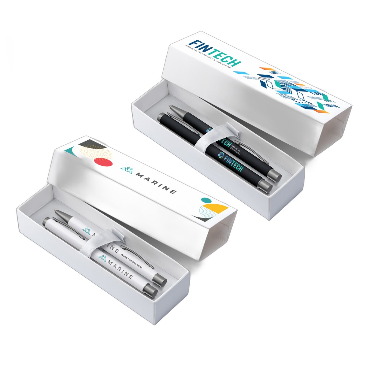 This gift set includes a white Bowie Ballpoint and white Bowie Rollerball metal pen, both featuring the ever-popular soft-touch rubberized finish. Both pens and the outside of the matte white gift box can be customized with a full-color imprint (ColorJet technology). Customers are sure to enjoy this gift—and the two different, yet smooth, writing experiences of both pens! Complies with Prop 65. 5.51" W x 0.39" D