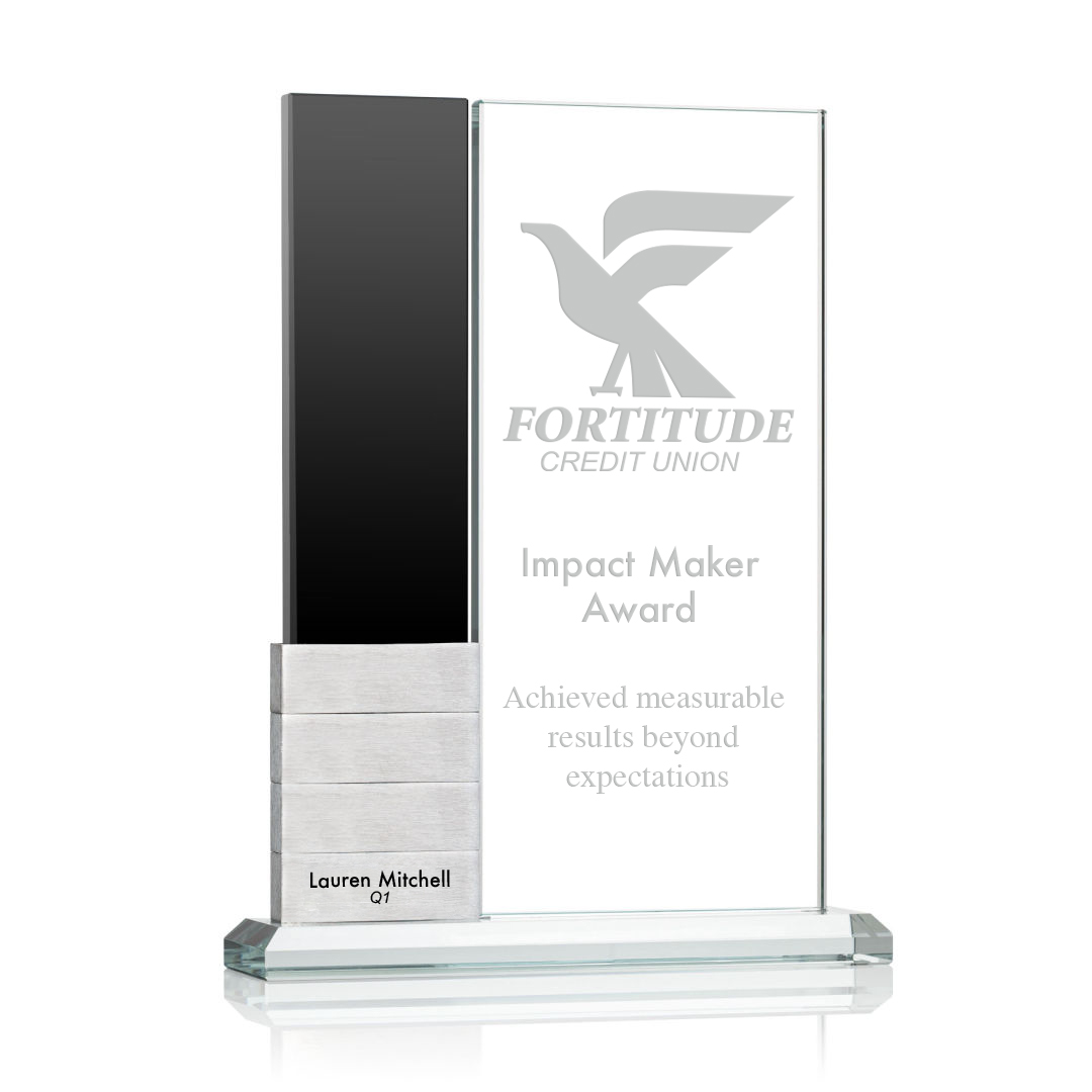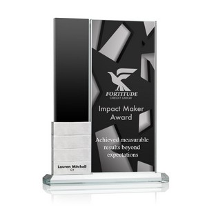 This unique perpetual award is perfect for employee-of-the-month programs, achievement recognition, or to commemorate important milestones. Its striking design features a vertical Starfire crystal tower with a side panel that holds up to 10 brushed-aluminum stackable blocks. This standout piece comes with one block; additional blocks are available for an extra charge. 10" W x 7.5" H x 2" D