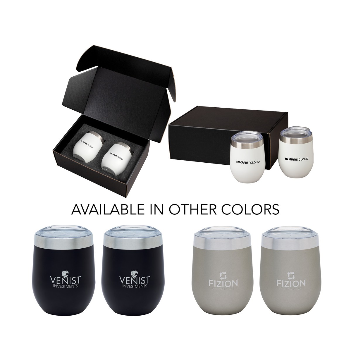 Gift the Brisbane II Two-Piece Classic Wine Tumbler Set to your customers or employees. This set includes 2 Brisbane wine tumblers with 12 oz. capacities each. With a double wall, copper lining and vacuum insulation, these tumblers will keep your hot drinks hot for 8 hours and your cold drinks cold for 12 hours. They are made with 304 stainless steel, have beautiful ergonomic designs and clear, push-in lids. Tumblers are FDA compliant and BPA free. Complies with Prop 65. 11" W x 4" H x 7 11/16" D