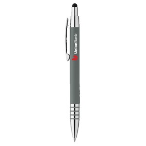 Plunge-action soft touch instant-dry gel pen. Matte rubber coated aluminum barrel with metal clip; chrome accents; black touch capacitive rubber stylus. No-smear black gel ink. 5.8125" H x 0.4375" W