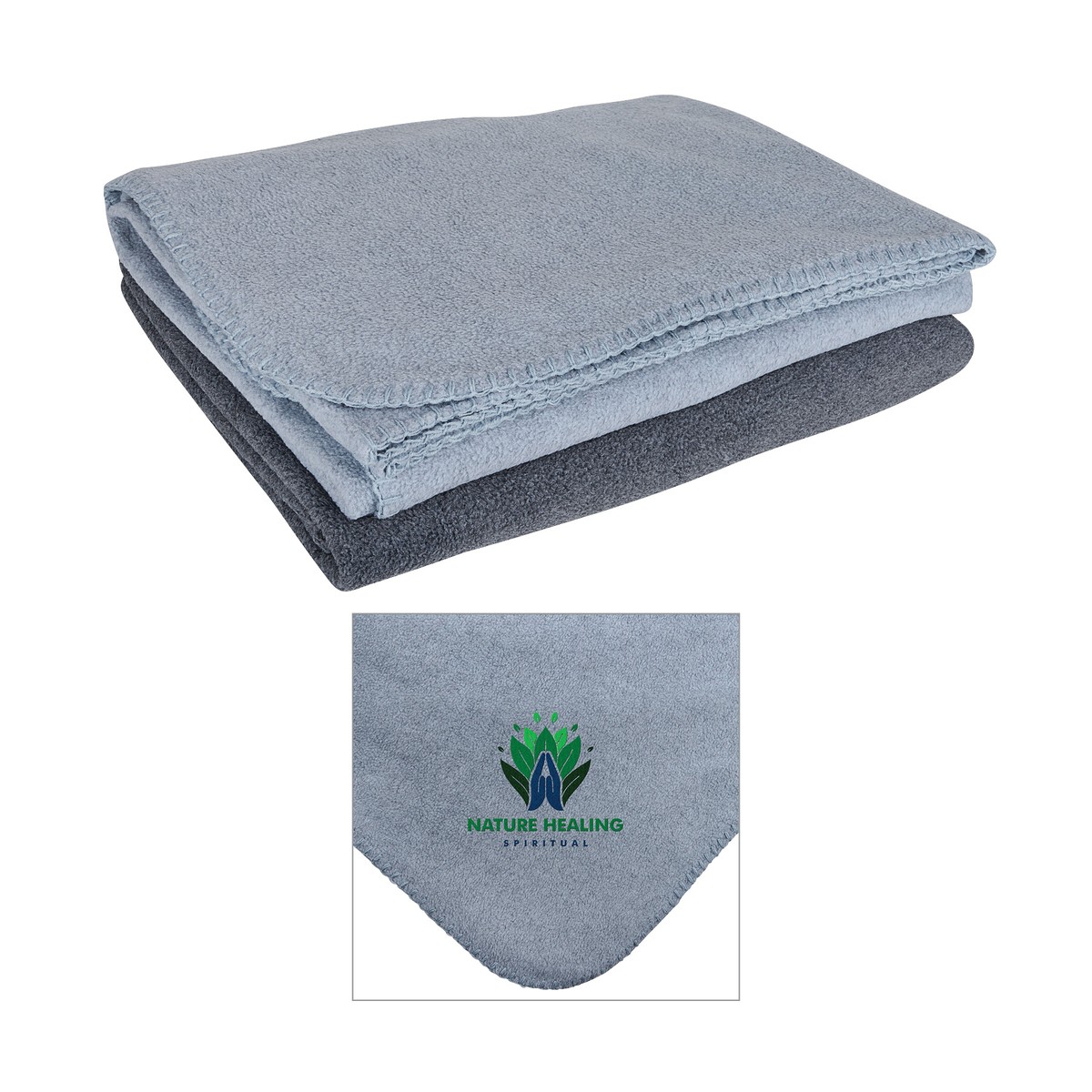 50" x 60" soft 260gsm anti-pilling fleece blanket with whipstitch edging, 100% polyester. Complies with Prop 65. 50" W x 60" H x 3/16" D