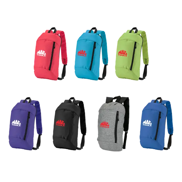 600D/210D lightly padded backpack. Front zipper pocket and main compartment; adjustable shoulder straps and top grab handle. 6.3125" D x 15.75" H x 9.4375" W