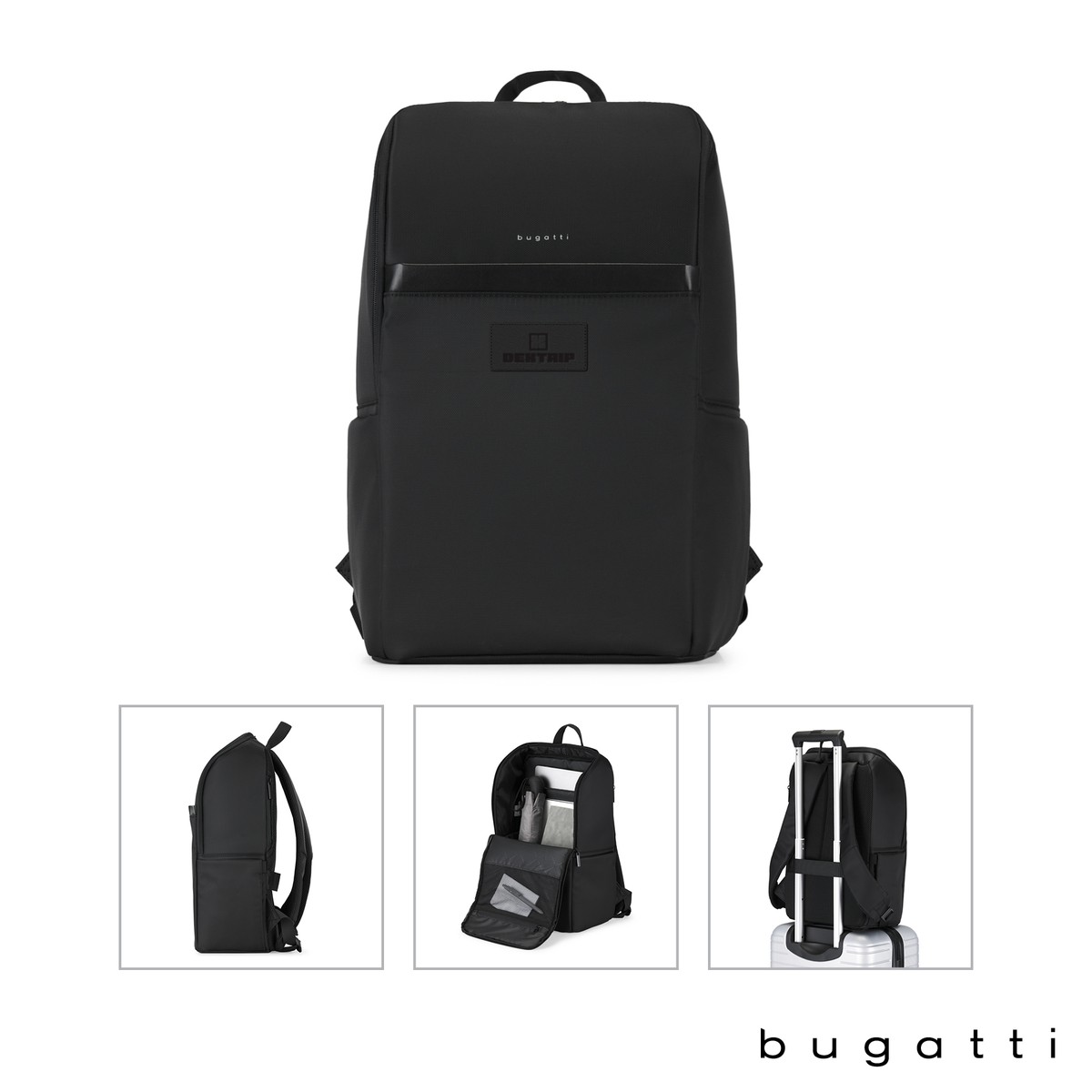 With sleek and modern styling, the Essential Backpack from Bugatti is made from durable, water-repellent nylon protecting your belongings while making a bold fashion statement during daily use and travel. It includes a padded laptop compartment that fits laptops up to 15 inches, keeping your device safe and secure. Multiple compartments help keep items organized, with front exterior zip pocket for quick-access essentials, an interior mesh zip pocket for smaller items and two expandable side slip pockets. Built-in RFID protection in a hidden zippered pocket adds extra security for cards and personal information. For comfort, the backpack features a padded back panel and adjustable padded shoulder straps for all-day wear. A trolley pass-through makes travel easier, and side pockets fit most water bottles for added convenience. Complies with Prop 65. 11 3/4" W x 17 3/4" H x 6" D
