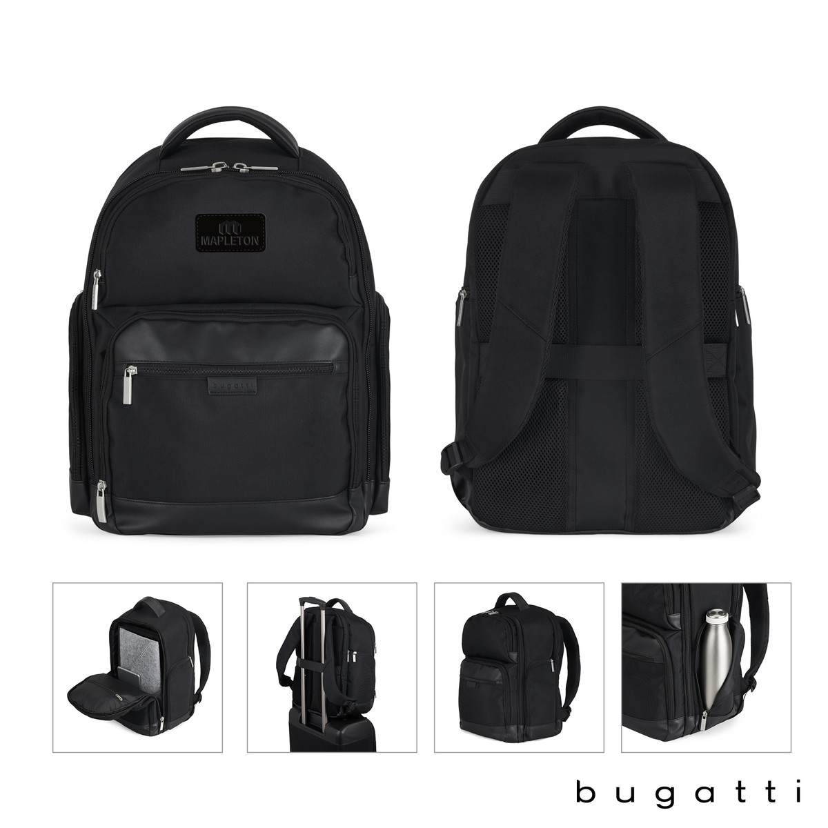 Designed with convenience in mind, the Bugatti Lucas Backpack provides top functionality to keep you organized whether traveling for work or pleasure. Its fully padded zippered backside pocket protects laptops up to 17.3" and its spacious main compartment includes a zippered accessory pocket. The lower front zippered pocket has an organizer panel with multiple pockets and stretch straps, a zippered RFID protective pocket and a key holder. Two additional zippered front pockets and two side zippered pockets offer additional storage for all your needs. Carry it comfortably with the padded top handle, padded adjustable backpack straps, or secure it to your rolling luggage with its trolley strap. The Lucas Backpack offers both comfort and functionality for your daily adventures. Complies with Prop 65. 12" W x 17" H x 8 1/4" D