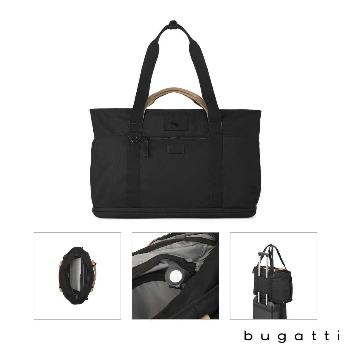 With the Vacilando Laptop Travel Tote Bag, the journey itself takes precedence over the destination. Designed with sustainability as well as practicality in mind, the exterior is crafted from water-repellent recycled polyester (RPET) and the interior has a soft lining also made from recycled materials. The rear exterior has a fully padded dedicated zippered pocket that holds laptops up to 16", trolley pass through panel and slip pocket. It features a large main compartment with lock-ready zippered closure, zippered RFID-secured pocket, hidden AirTag holder (AirTag not included), organizer pocket, carabiner key strap and 3" expandable base with reinforced stiffener for extra protection and storage needs. The front has 2 side elastic slip pockets and a zippered front accessory pocket. Dual top handles provide short and over the shoulder carrying options. Complies with Prop 65. 21" W x 14" H x 8 1/2" D
