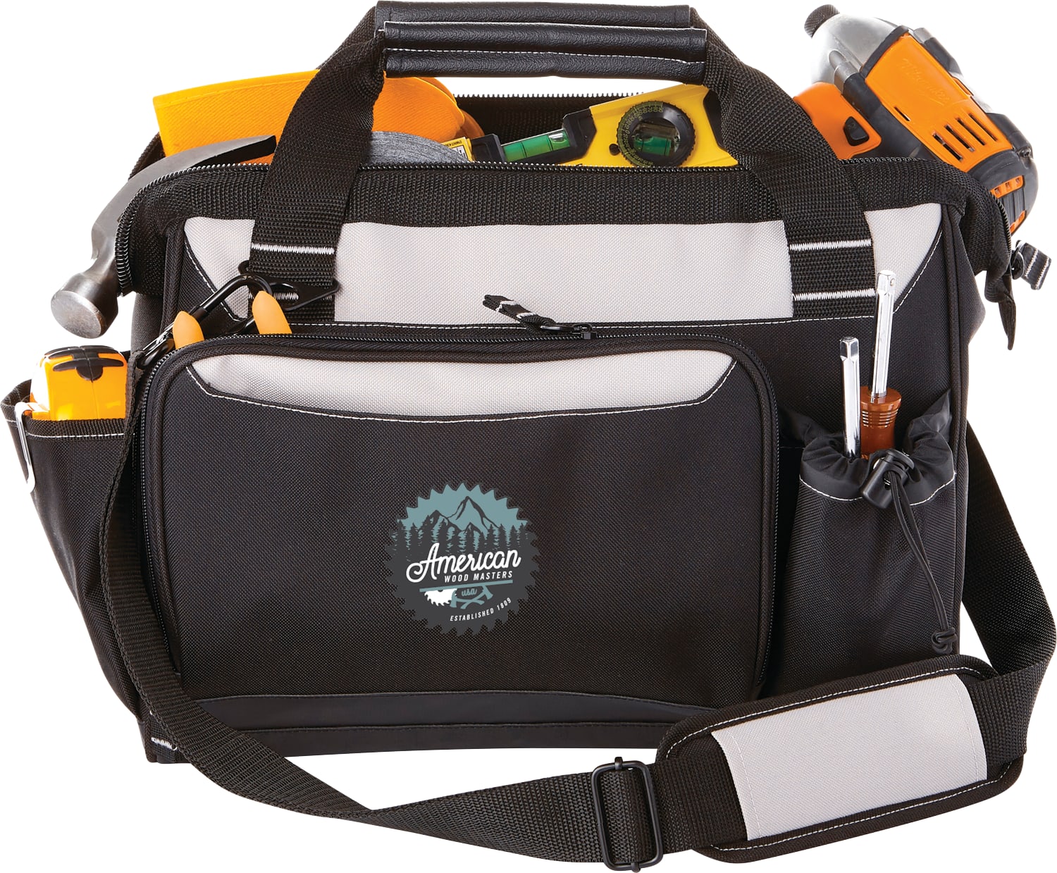 The Built2Work 14" Molded Base Tool Bag is perfect for any DIY or home improvement enthusiast. Made from 600D polyester with a durable molded base, this rugged bag will stand up to the weight of your tools and accessories. It features one exterior side pocket, one front zipped pocket, and a convenient water bottle front pocket. It also has a metal wire frame that provides easy access to the interior webbing loops that keep your tools neatly organized. This PolyCanvas bag also has reinforced handle-grips and a padded strap to let you carry your tools with ease. 8.00" D x 14.00" W x 11.00" H