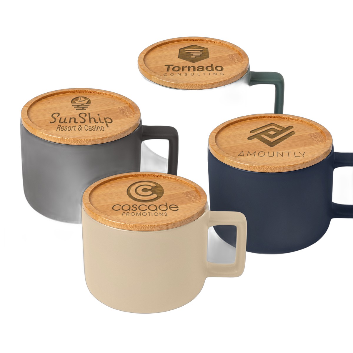 The Café Virtuoso - 12 oz. Ceramic Mug with Bamboo Lid is a stylish and functional choice for any drinkware collection. This ceramic mug features a matte finish exterior and a shiny finish interior, offering a sophisticated look and feel, with silkscreen decoration. It comes with a bamboo lid, made from bamboo, which can also be used as a coaster and can be separately laser engraved. With a comfortable handle and a capacity of 12 oz., this mug is perfect for both hot and cold beverages. Suitable for microwave use without the lid, but not for dishwashers. Ideal for everyday use, the Café Virtuoso mug is a versatile choice for any setting, whether at home or in the office. Complies with Prop 65. 3.35" H x 2.95" W