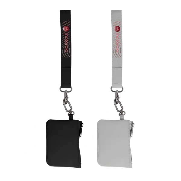 Featuring a durable polyester webbing wristlet with a sleek leatherette accent and modern gunmetal clasp, this set proves that utility can be good-looking. The clasp snaps easily onto the Benton Rectangle recycled PU zip pouch—outfitted with rPET-lined zipper compartments—so your keys, cards, or cash stay secure (and sustainable). Slip the lanyard onto your wrist and you've got hands-free convenience that keeps your small essentials close, whether you're dashing to a meeting, catching a flight, or running errands in style. 1" W x 9.05" H