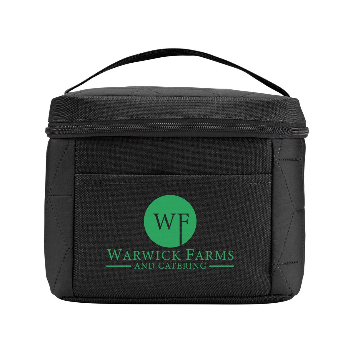 300T Polyester. Soft, luxe finish with ultrasonic snowflake design. Top zippered opening to main compartment. Front pocket. PEVA lining keeps items warm or cold. Holds 6 cans. 8.7000" W x 7.5000" H x 6.3000" D
