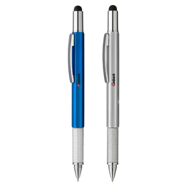 Multi-function level tool pen with stylus, level, flathead screwdriver, Phillips head screwdriver, us ruler and metric ruler. 5.875" D x 0.375" W