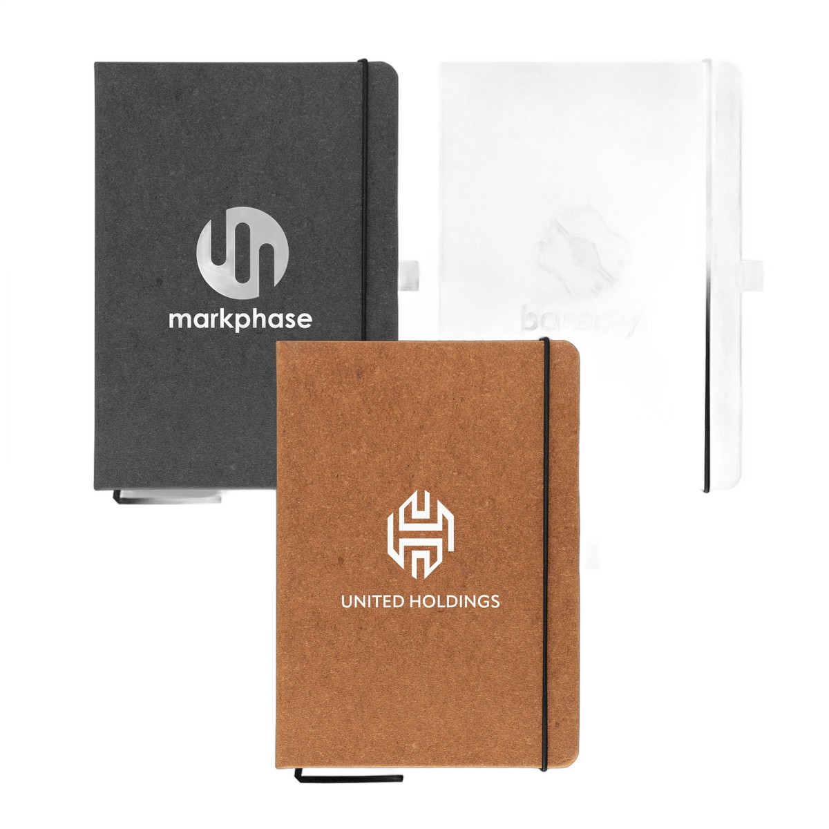 Introducing our Carson Recycled PU Leather Notebook - it's ideal for journaling at home and meetings at work. The hard cover is made from 75% recycled leather and 25% plastic. the 80 sheets (160 pages) of 70 gsm renewable, recycled paper are ivory colored and lined recycled paper. This stylish notebook features a ribbon marker, stitched binding, elastic strap and pen loop (pen not included). Your logo will be . Complies with Prop 65. 8.27" H x 5.83" W x 0.59" D