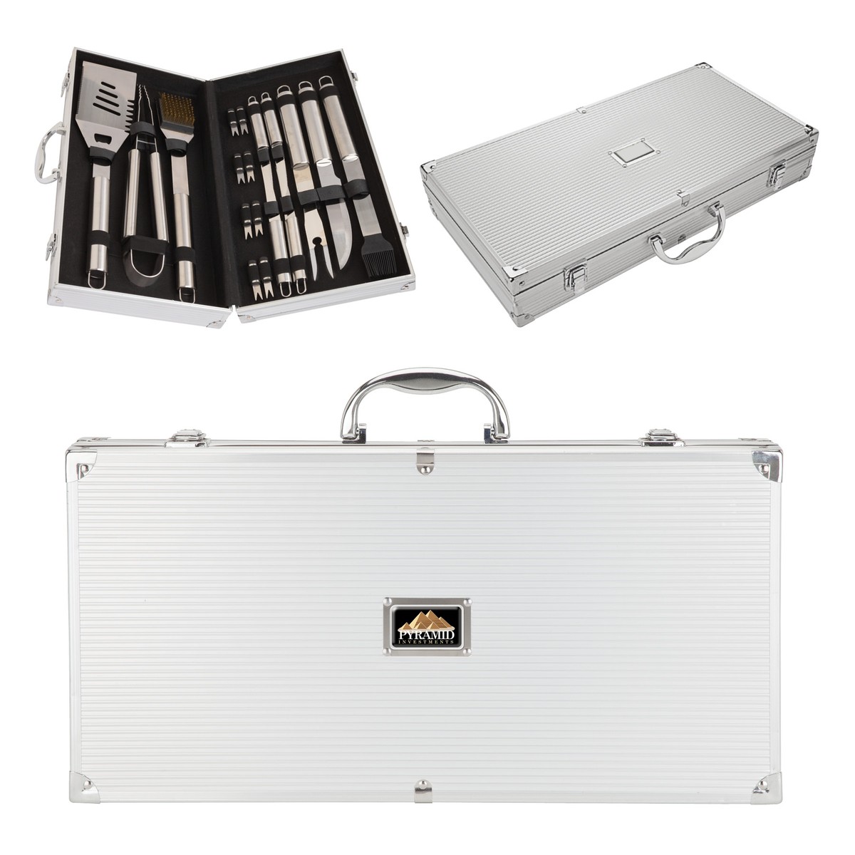 18 piece BBQ set in metal-edged case includes basting brush, fork, large knife, scraper / brush, tongs, multi-purpose spatula, 4 steak knives, 8 corn holders. Complies with Prop 65. 19" W x 10" H x 3 1/4" D