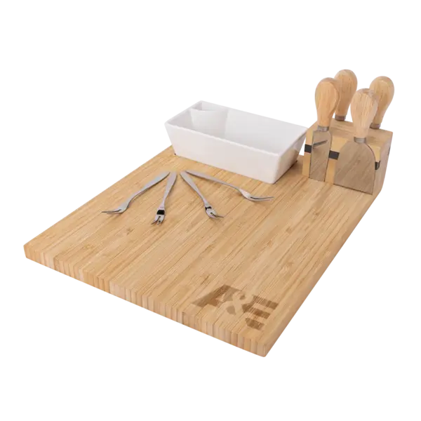 Introducing our Charcuterie Board Set - the ultimate choice for elegant hosting. Crafted for style and function, this set includes a bamboo board and essential utensils, making it perfect for creating stunning charcuterie displays. Elevate your gatherings with this exquisite set, designed to impress and inspire. Additional optional imprint area is 3.5"w x 1.25"h pad printed on bowl long side. 10.63" W x 12.99" L x 0.59" H