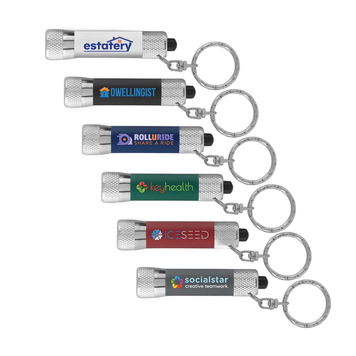 Customers will appreciate this functional (and stylish) LED flashlight keyring. This flashlight features a comfortable, rubberized soft touch finish with texturized silver accents, and shines a bright white LED light. Available in a variety of barrel colors. Decorate with a full-color, photo-quality imprint with our innovative ColorJet printing capabilities. Excellent for tradeshows, gift baskets, team building events, and so much more. 3- LR44- ANGLI batteries Included. Complies with Prop 65. 0.63" H x 2.70" W x 0.63" D