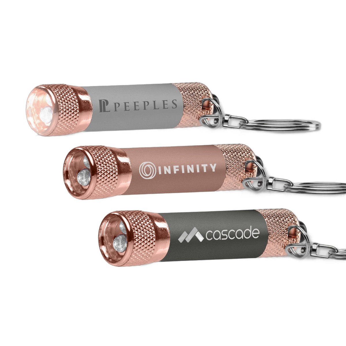 Customers will love the rose gold trim and metallic soft-touch barrel on this super-stylish and functional LED flashlight keyring. This 3-LED flashlight shines a bright white light, and includes a keyring to help keep this flashlight always at the ready, right when you need it. . 3- LR44-Batteries Included. Complies with Prop 65. 2.68" H x 0.56" W x 0.56" D