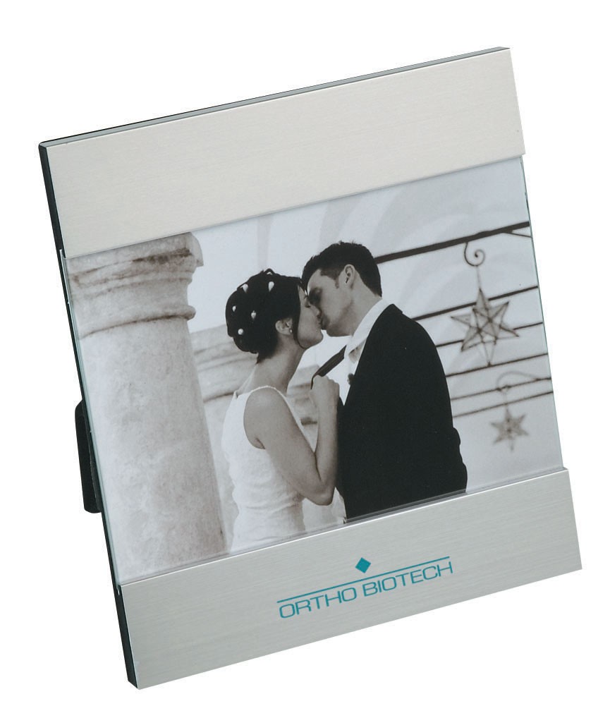Horizontal border photo frame with aluminum finish and easel back fits 7" x 5" photo. Complies with Prop 65. 7" W x 8" H x 9/16" D