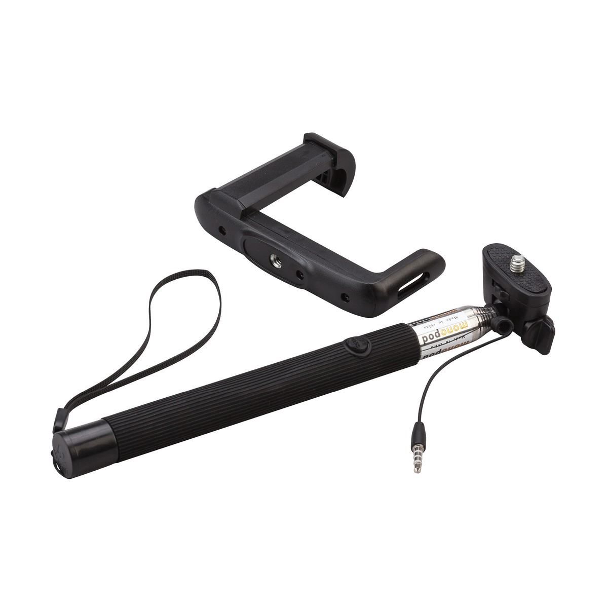 Selfie stick features a stainless steel handle and ribbed rubber grip. Hold your phone at a better distance for your next shot using the spring-loaded clamp. Insert the 3.5mm plug into your phone, turn on your camera and capture the moment with the handle-mounted shutter button. No batteries or Bluetooth necessary. The stick extends to 38" and can hold phones up to 3" wide. This selfie stick will work with the Iphone lightning-to-3.5mm input adapter. Complies with Prop 65. 4 3/8" W x 12" H x 1" D