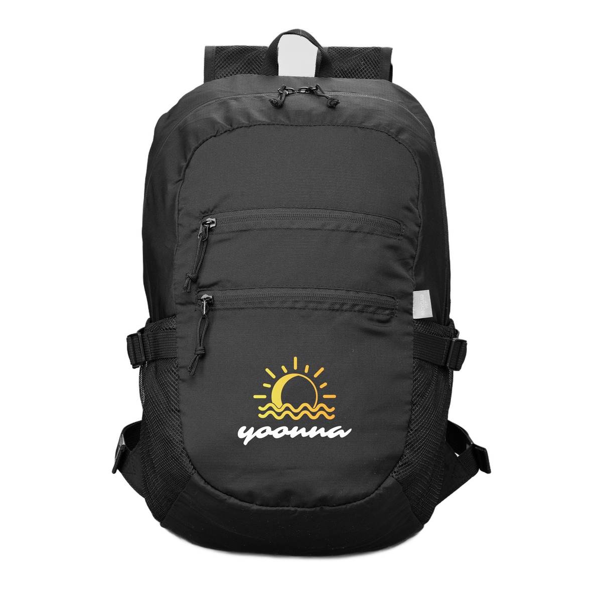 Simplify your carry with our Clover Backpack a versatile and practical bag designed for the modern traveler who values portability. This 27-liter backpack's panels are made from durable 240T 100% post-consumer recycled polyester, offering the look and feel of nylon at an accessible price point. The key feature is the detachable internal pouch, which can be used for extra organization or to fold and store the backpack compactly. It also includes two front zip pockets, two mesh side bottle pockets, and a spacious main compartment with a two-way zipper. Compression straps on the sides provide extra capacity and secure items during travel, making the Clover an ideal, lightweight solution for travel and everyday use. 17.72" H x 11.81" W x 7.87" D