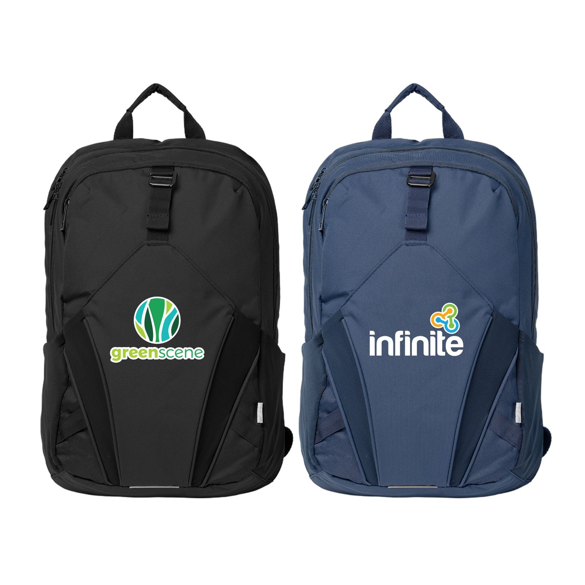 Your brand, front and center. The Coastal Threads™ Utility Backpack offers a slim-profile design and a modern look that fits seamlessly into commuting and travel. The exterior is constructed with 300D Repreve® Our Ocean™ plastic threads, made from ocean-bound plastic bottles collected within 30 miles of waterways or coastal areas. Its 210D rPET interior is designed for practical organization, featuring a padded laptop compartment, tablet sleeve, and multiple utility pockets. Comfortable padded straps, mesh back support, trolley strap, and durable grab handles make it a commuter's best friend. Reflective details and an elastic side pocket for drinkware add to its functionality. Fits common laptop sizes including 13", 14", 15", 16" and 17". Complies with Prop 65. 17.72" H x 11.81" W x 5.51" D