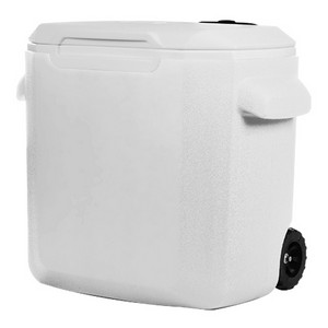 Coleman® 28 qt. Wheeled Cooler with a retractable handle, holds 36 cans, and high-density foam insulation for thermal retention. 13.5" Diameter x 16.5" H