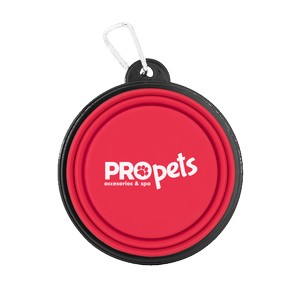 Compact silicone collapsible pet bowl with metal carabiner easily attaches to bags, belt loops, or leashes. Designed for food and water, hand wash recommended. 2.125" H x 5.125" W