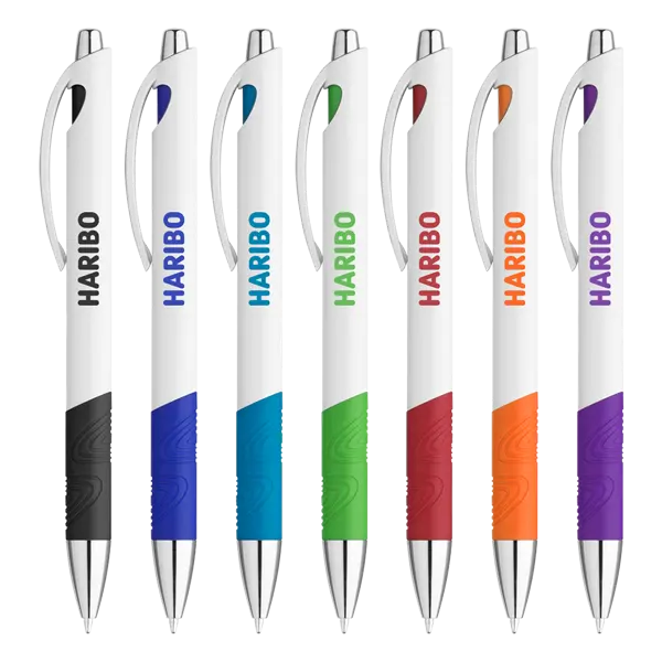 Plunge-action ball point pen. White glossy barrel with accent color soft touch swirl design rubber grip and shiny chrome accents. Black ballpoint ink. 5.5625" D x 0.4375" W