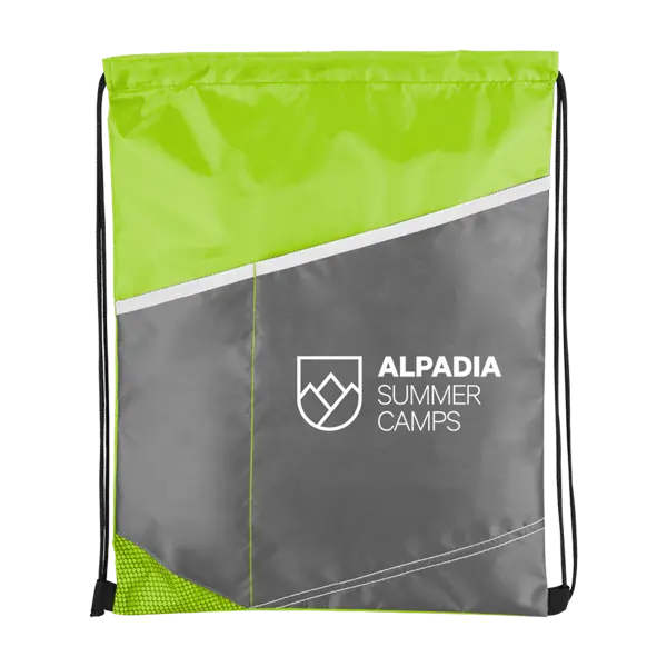 210D drawstring sports pack with diagonal gray front pockets. Two front pockets with contrast stitching; accent mesh corner; black cord straps; packs flat. 17.5" H x 13.5625" W