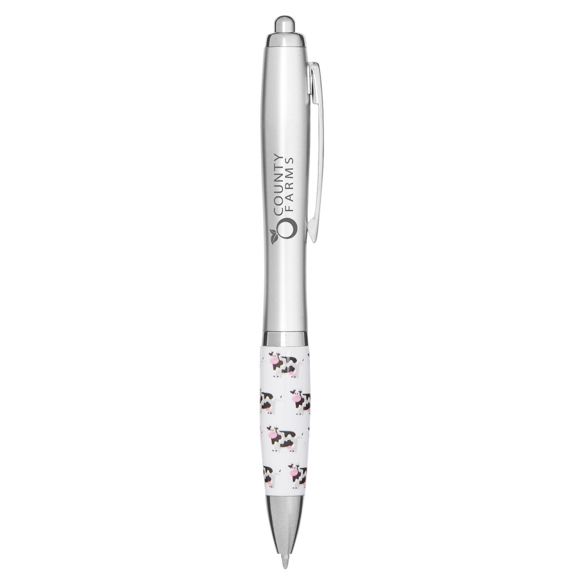 **A Prime Line® Exclusive!** Retractable curvy plastic barrel ballpoint pen with cow spot stock art comfort grip. Features metallic silver accents. Click-action mechanism with high quality, black, medium-point ink. 5.5" L x 0.5" Diameter