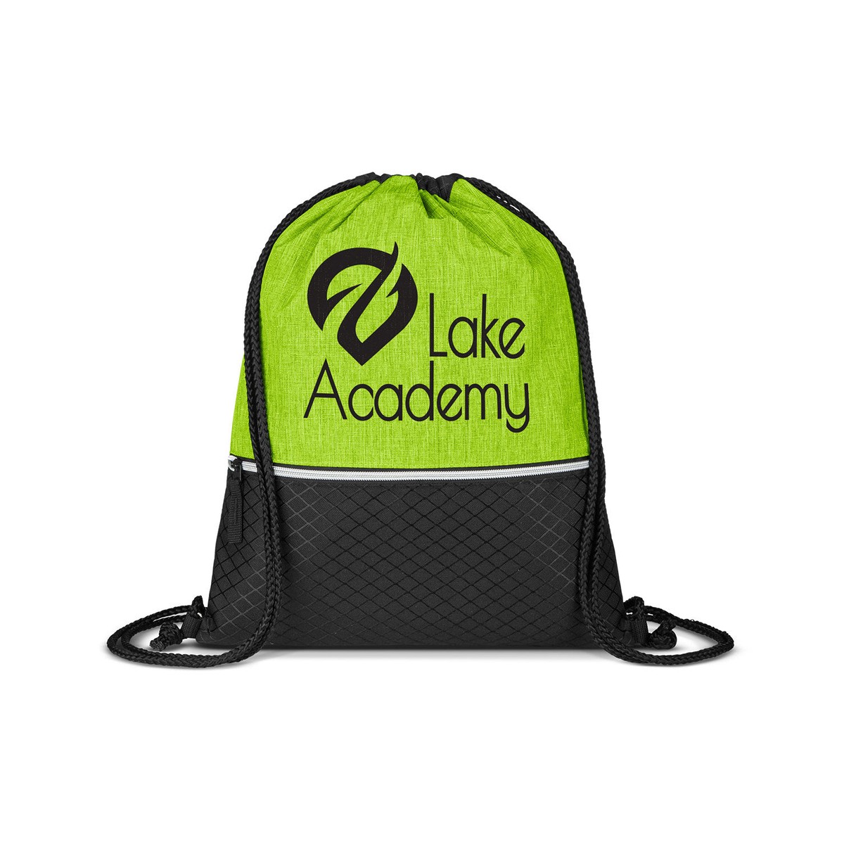 Drawstring bag made of of 300D Polyester with PU backing with 600D Polyester textured front pocket. Solid black 420D Polyester back and 210D Polyester lining. Front zipper pocket measures approx. 13.5"w x 6.5"h. To clean wipe with damp cloth. Recommended weight tolerance: 22 lbs. 13.5000" W x 17.5000" H