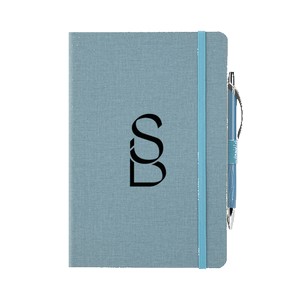 Soft bound 80 sheet lined notebook with crosshatch PU cover and color matched elastic bookmark, pen loop, and patterned pen. Features an envelope pocket on the inside back cover and cream pages with date fill-in section. 8.25" H x 5.5" W