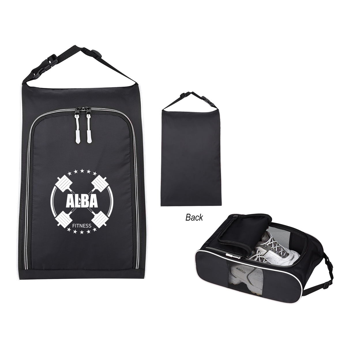 Made Of 420D Polyester. Double Zippered Main Compartment. Side Mesh For Ventilation. Adjustable Web Carrying Handle With Buckle Closure. Accommodates Most Shoes Up To US Men's Size 12. Spot Clean/Air Dry. Complies with Prop 65. 5.5" D x 9.75" W x 15" H