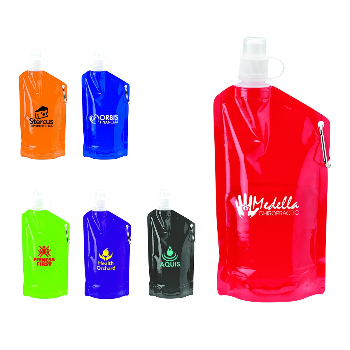 24 oz. PE plastic water bottle features a drinking spout, safety strap on lid, flattens for easy transport, includes a 50mm aluminum carabiner clip and is BPA free. Designed exclusively by Logomark. Carabiner can be used to hook onto your bag or sport field fence or can be used to secure the bottle for storage when rolled up. Complies with Prop 65. 5 1/8" W x 11 3/8" H x 1 7/16" D