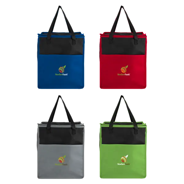 Stay cool and carry with confidence with the Crystal Cove Recycled Grocery Cooler. Crafted from color-blocked recycled 80gsm non-woven material, this roomy bag combines style with sustainability. Its foil-lined insulation and top zipper closure lock in the chill, while a handy front slip pocket keeps essentials within easy reach. Designed with sturdy handles for grab-and-go convenience and a generous 60-can capacity, it's the perfect partner for shopping, picnics, or any adventure that calls for eco-friendly cooling power. 13" W x 15.25" H x 9.5" D