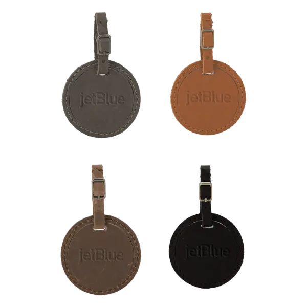 There are those who travel and those who stagnate. This proud beacon latched securely to your luggage might as well be inducted into the known traveler hall of fame because this unit has your number. Featuring your brand proudly debossed in the center of our leather badge of honor, it's circular shape a reminder that your's is the universal symbol of timelessness, original perfection, and all cyclical movement. That's the circle of life, be de'boss on your next journey. Complies with Prop 65. 3" W x 5" H