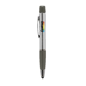 Isn't she lovely? Isn't she wonderful? Yes and yes! Meet the Curvaceous Trio Color Highlighter Pen. This pen has it all: a stylus tip that writes black ballpoint, a silver sprayed barrel, and a highlighter top. Highlighter colors include blue, pink, and yellow. Proudly display her on your desk and get a few for your customers while you're at it.