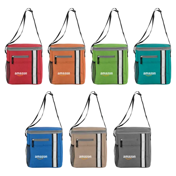 300D heathered polyester lunch bag with insulated gray PEVA lining. Top zip main compartment; two front pockets; side mesh pocket; two-tone webbing and gray accent trim; adjustable shoulder strap; 12 can capacity. 5.75" D x 10.625" H x 9.75" W
