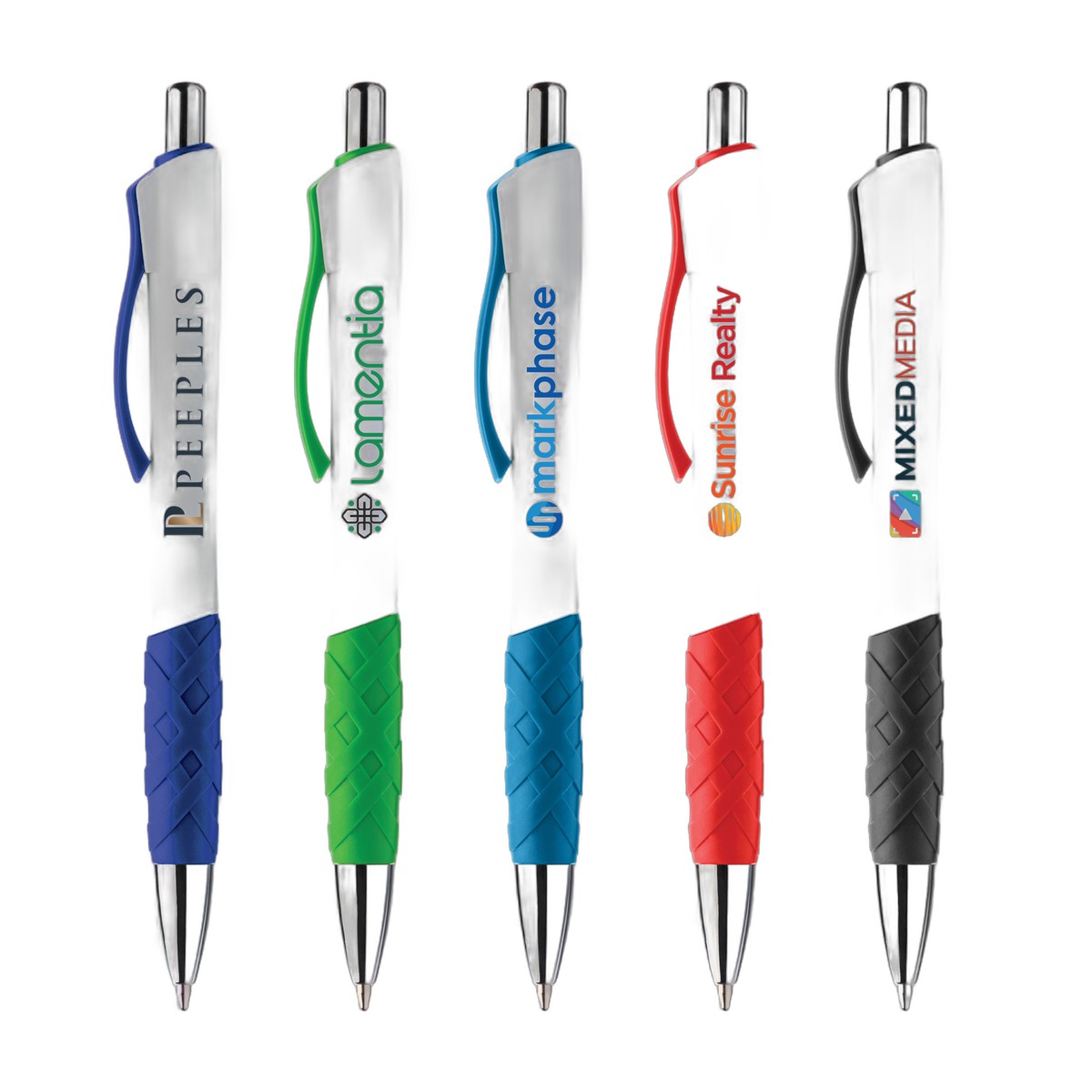 The Delano is a plastic retractable ballpoint pen that features a matching silkscreen imprint and trim color. Choose a trim color, upload artwork, and voila! Imprints are matched to the trim and placed on an opaque white barrel for added contrast. This pen features a unique rubber grip that has a unique link pattern and texture. An excellent value for the quality. Complies with Prop 65. 5.51" W x 0.46" D