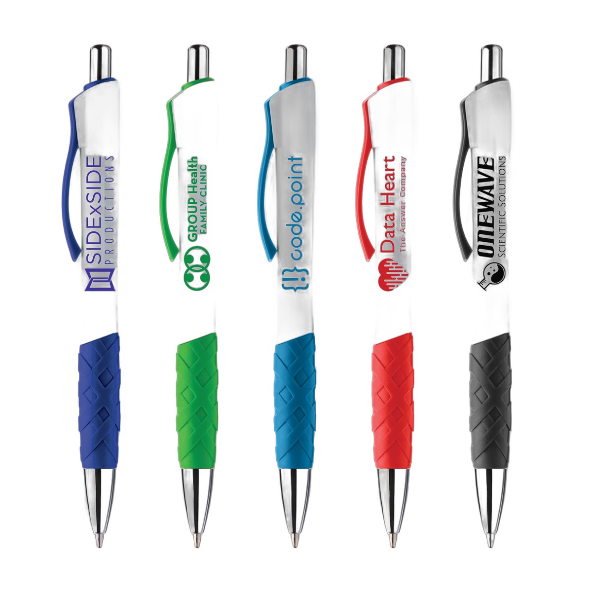 The Delano is a plastic retractable ballpoint pen that features a matching silkscreen imprint and trim color. Choose a trim color, upload artwork, and voila! Imprints are matched to the trim and placed on an opaque white barrel for added contrast. This pen features a unique rubber grip that has a unique link pattern and texture. An excellent value for the quality. Complies with Prop 65. 5.51" W x 0.46" D