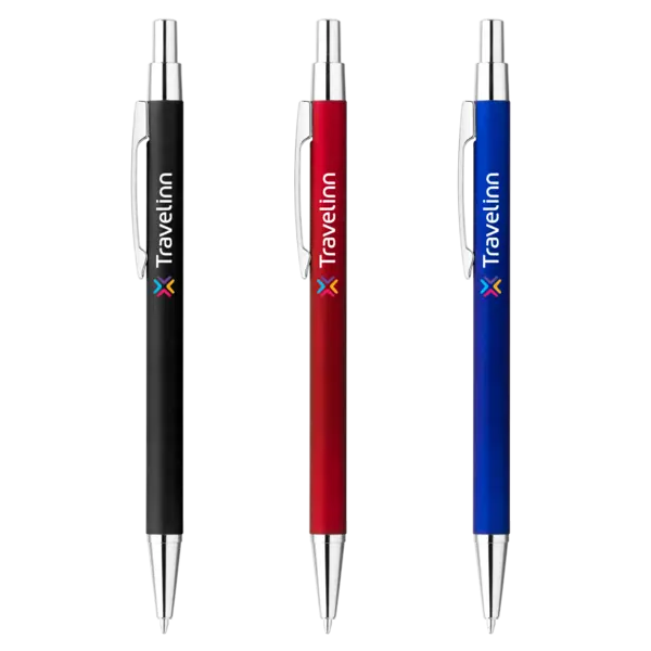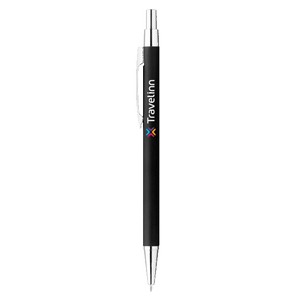 Plunge-action soft touch coated ballpoint pen. Silver plunger, clip and tip; slim aluminum barrel. Black ballpoint ink. 5.5" D x 0.3" W
