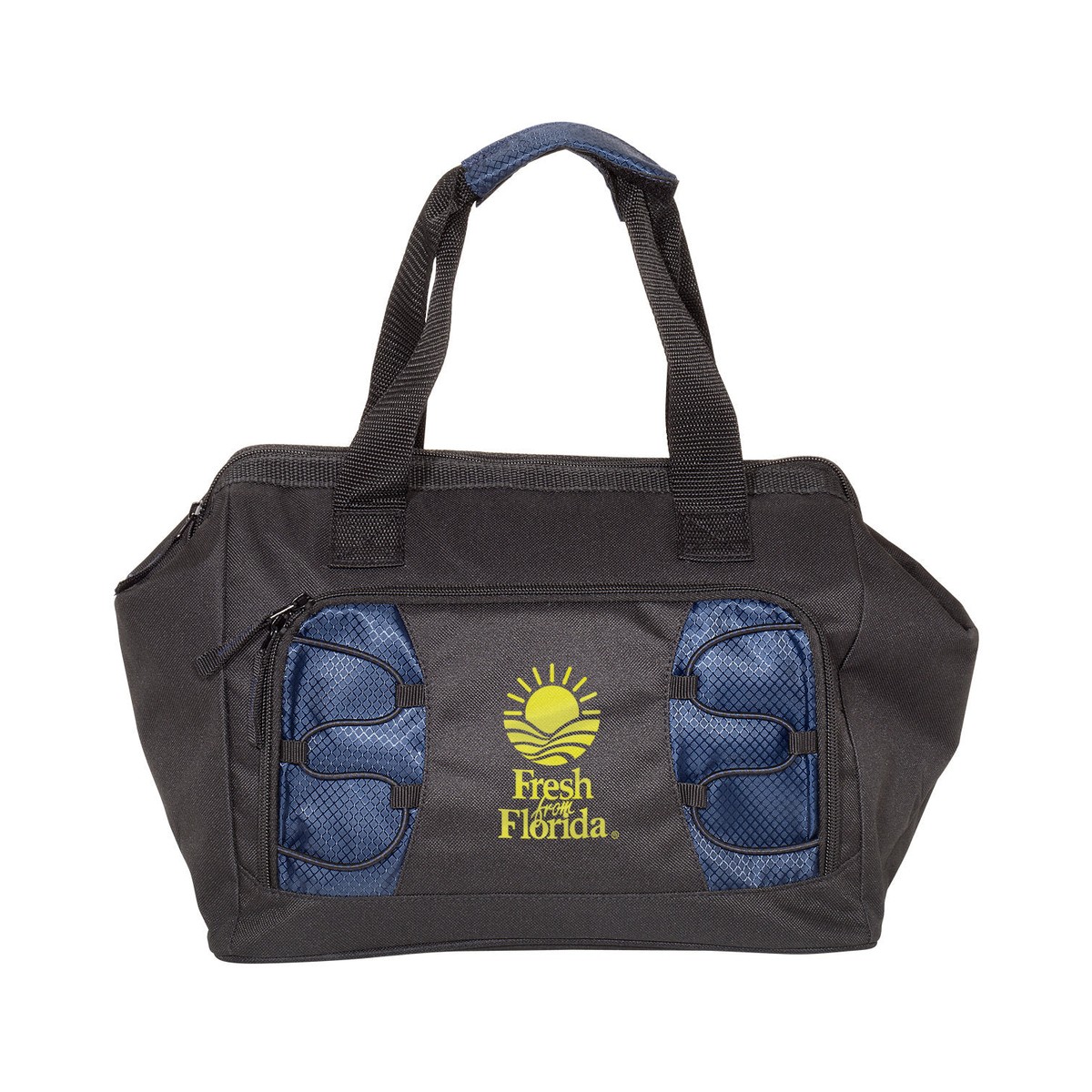 Durable 600D Polyester and PVC cooler with Ripstop and PU coated exterior and 5mm foam with PEVA lining. Features top zipper open main compartment and one open pocket on front with bungee cord accents. Polypropylene woven tape padded carry handles (18.5"l). Hand-wash only; wipe clean with damp cloth. Do not iron. Holds up to 6 cans of soda. Recommended weight tolerance: 22 lbs. 18.5000" W x 10.0000" H x 7.7500" D
