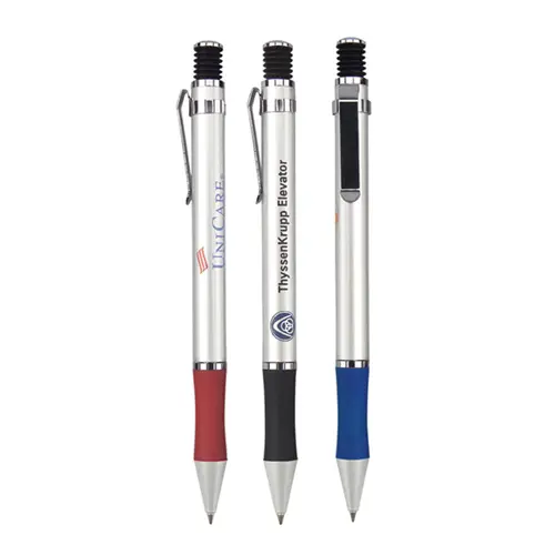 The Diana Aluminum is click action, ballpoint. It has a silver finished barrel with accordion style plunger and colorful gripper.