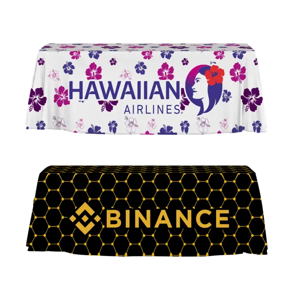 Let your table do the talking. Our 3-sided open back table throw brings big energy to your booth with full-color dye sublimation that lets your branding shine—loud, proud, and totally on point. Made from durable 300 denier poly poplin, it drapes beautifully in the front and sides while keeping the back open for easy access to storage, swag, or emergency snacks (we don't judge). Finished with clean, clear-thread serged edges for a polished look that's built to last, this table throw is your blank canvas for bold design, bright color, and show-stopping presence. Unlimited design possibilities? Yeah, we thought you'd like the sound of that. 96" W x 30" L x 28.5" H