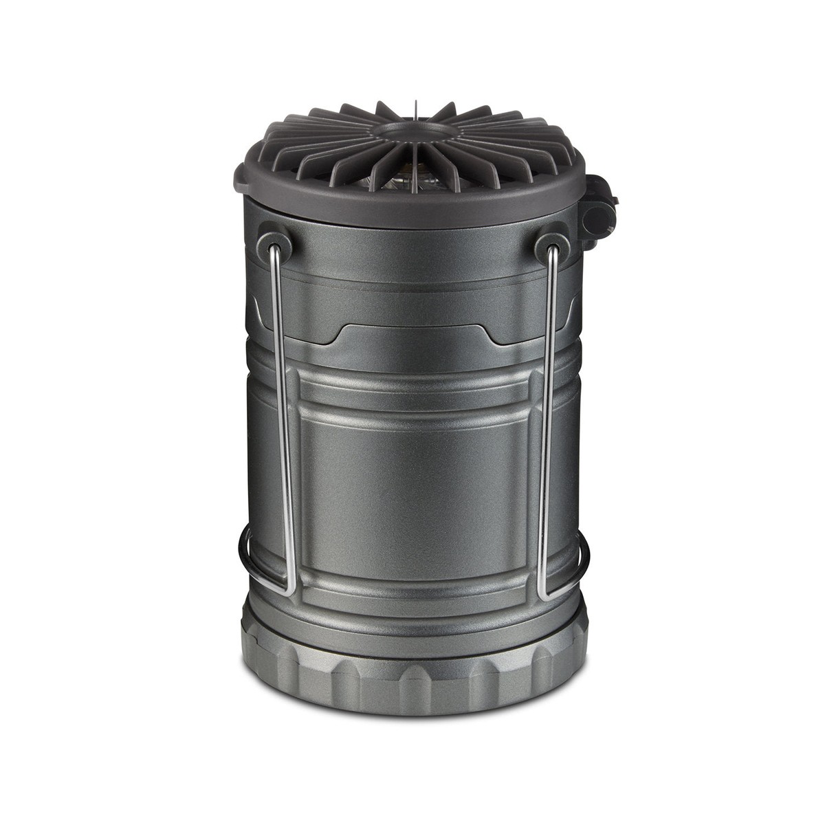 Camping style lantern with bright COB light and mini fan. Made of ABS Plastic. Pull open to release light. Iron handles at top for carrying or hanging. COB with 200 lumens. Uses 3 AA batteries, included and replaceable. Instructions included. 5.1250" H x 3.2500" Diameter