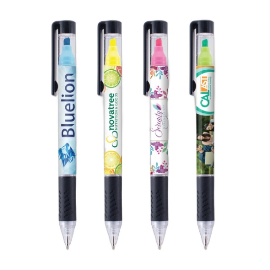 Stack the odds in your favor by adding this Duplex pen to your advertising campaign! The pen combines a black medium ballpoint with a yellow, blue, pink or green felt tip highlighter at the opposite end. Facebook and twitter icons can be added to your layout at no additional charge. An imprint of your company's name and logo will help spread your brand near and far. It's a useful promo tool for banks, educational facilities, restaurants and any other corporation that writes down any information at all. Customize yours today!