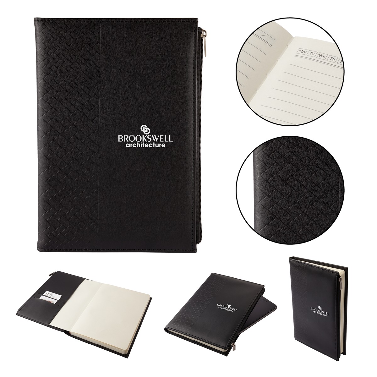 The Durham junior journal has 80 lined cream colored pages and features a stylish leatherette cover with a tile design around the spine. The front cover features a side loading zipper pocket to keep essentials safe. On the inside cover there are two slots for cards or other important papers. Journal book is replaceable. Complies with Prop 65. 6" W x 8 5/8" H x 1" D