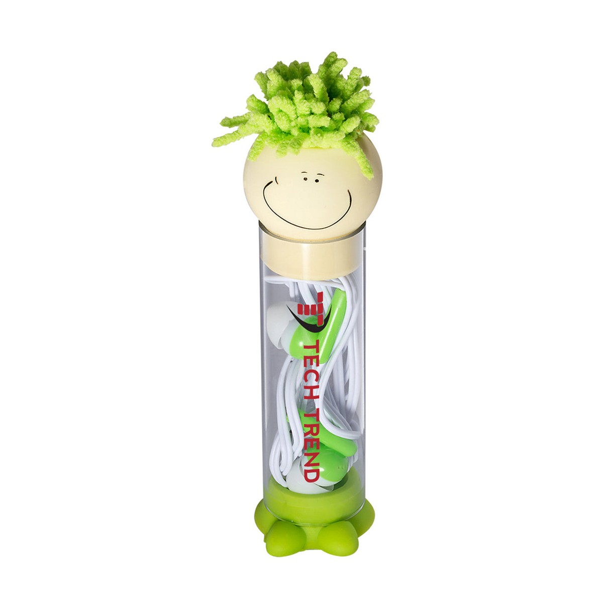 Clear AS plastic case comes filled with earbuds (PVC cable, Silicone buds) and helps keep them tangle free. MopToppers® head doubles as lid and the fabric hair can be used as a screen cleaner. Designed for use with phones and other devices with 3.5mm jack. Silicone base (shoes) can be used to position the device to search as phone stand. 5.2500" H x 1.3750" Diameter