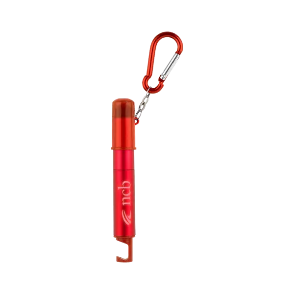 Four-in-one multi-functional ballpoint pen with color matching carabiner clip. Metallic colored light up barrel with color matching translucent cap, touch capacitive stylus, cellphone stand, and LED flashlight. Black ballpoint ink. 4.8125" D x 0.4375" W